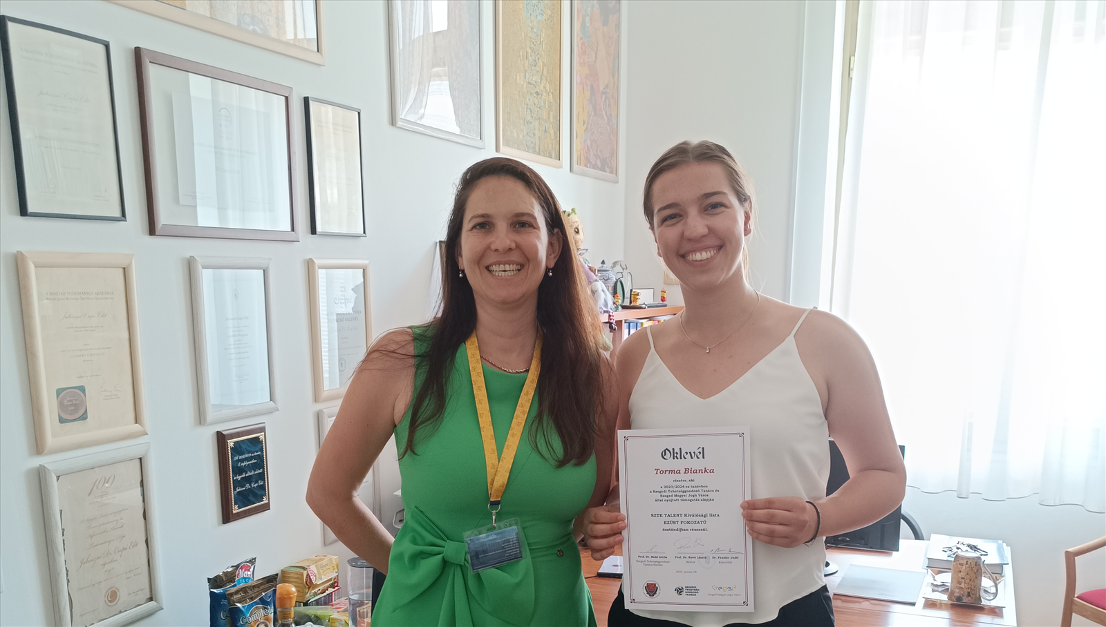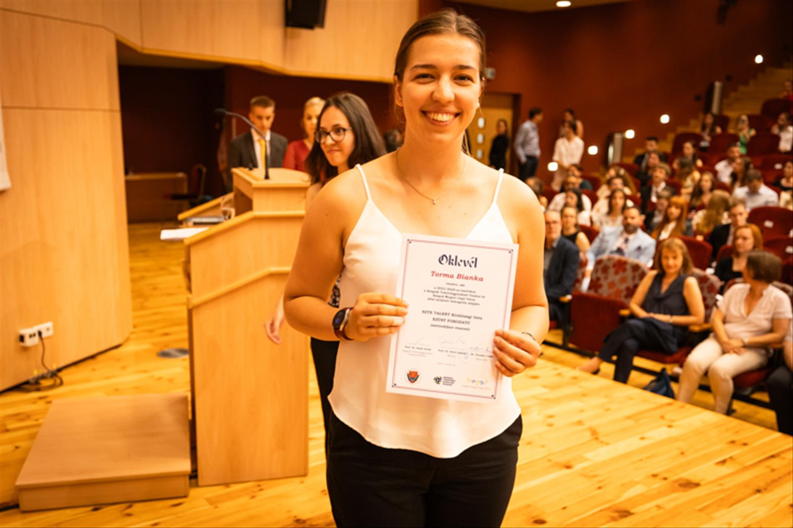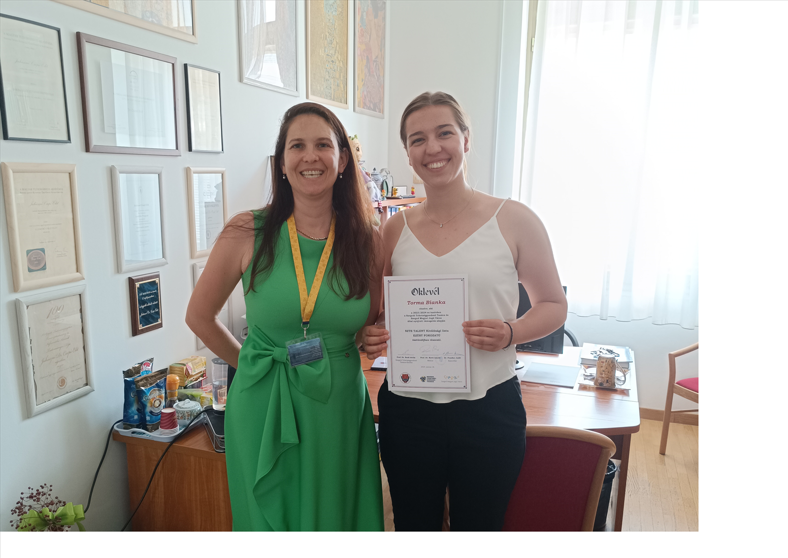 A kiemelkedő tanulmányi, művészi vagy sporteredményéért összesen 169 hallgató vehette át ösztöndíját és az ezzel járó elismerő oklevelet az idei Talent gálán. A gálát 2024 évben június 18-án az SZTE József Attila Tanulmányi és Információs Központ kongresszusi termében rendezték meg. A pályázatot tanévenként egyszer hirdeti meg a Szegedi Tehetséggondozó Tanács Szeged Megyei Jogú Város Önkormányzatával, és a Pro Talentis Universitatis Alapítvánnyal együttműködve a Szegedi Tudományegyetem hallgatói számára. A Kiválósági Listára három a graduális (Ba/BsC/Ma/MsC és osztatlan) képzésben résztvevők (ezen belül tudományterületenként alkategóriákban), sportolók és művészek jelentkezhetnek. A tudományos önéletrajza mellett Bianka a korábban elnyert ösztöndíjai, TDK és OTDK helyezés, nemzetközi folyóiratban megjelent szakcikke [1] valamint szintén nemzetközi konferencia részvétele [2] végül, de nem utolsó sorban demonstrátori tevékenysége alapján találták méltónak az elismerésre. Külön öröm, hogy Bianka mellett számos vegyész hallgatótársa kapott elismerést.
