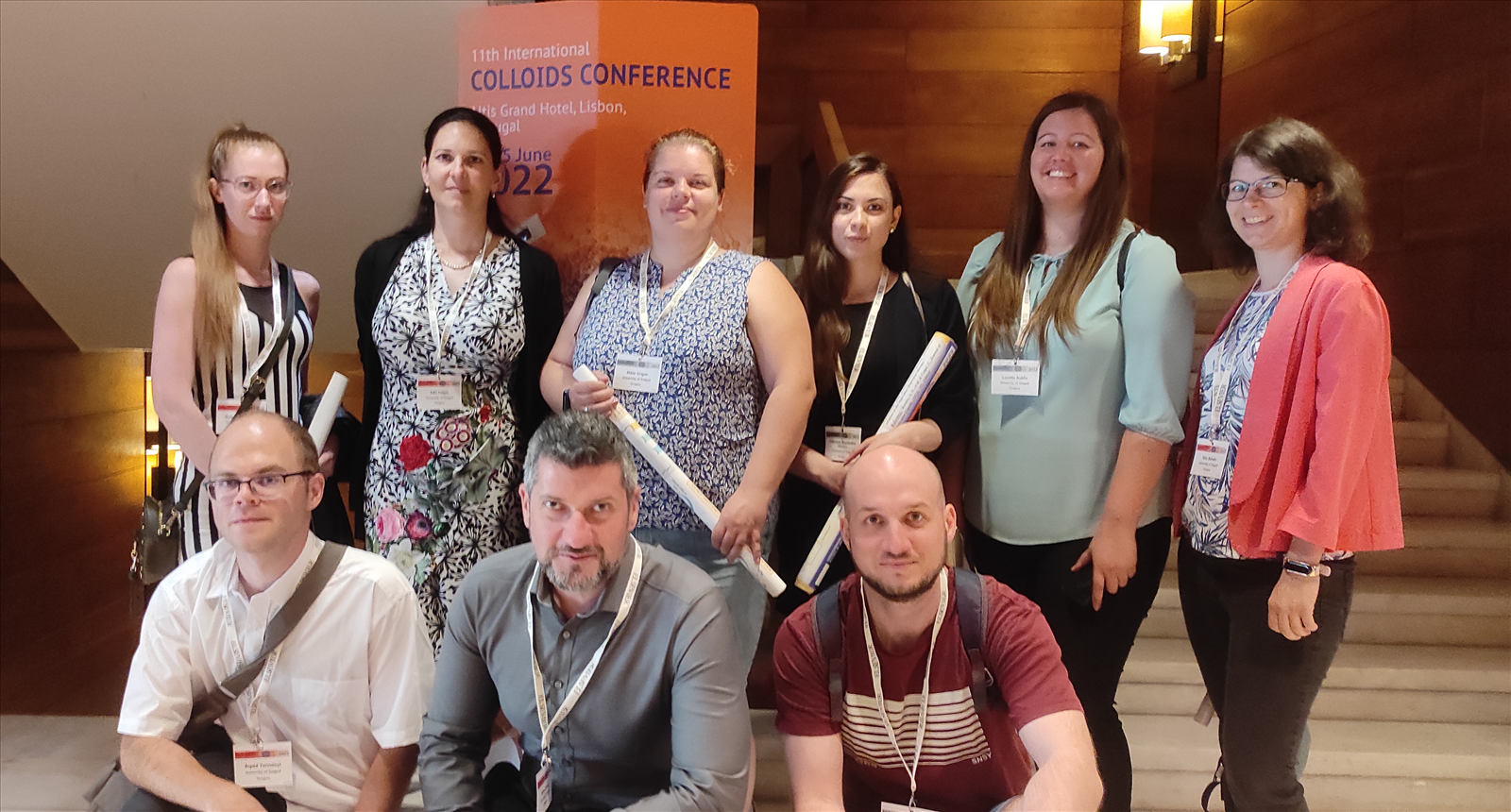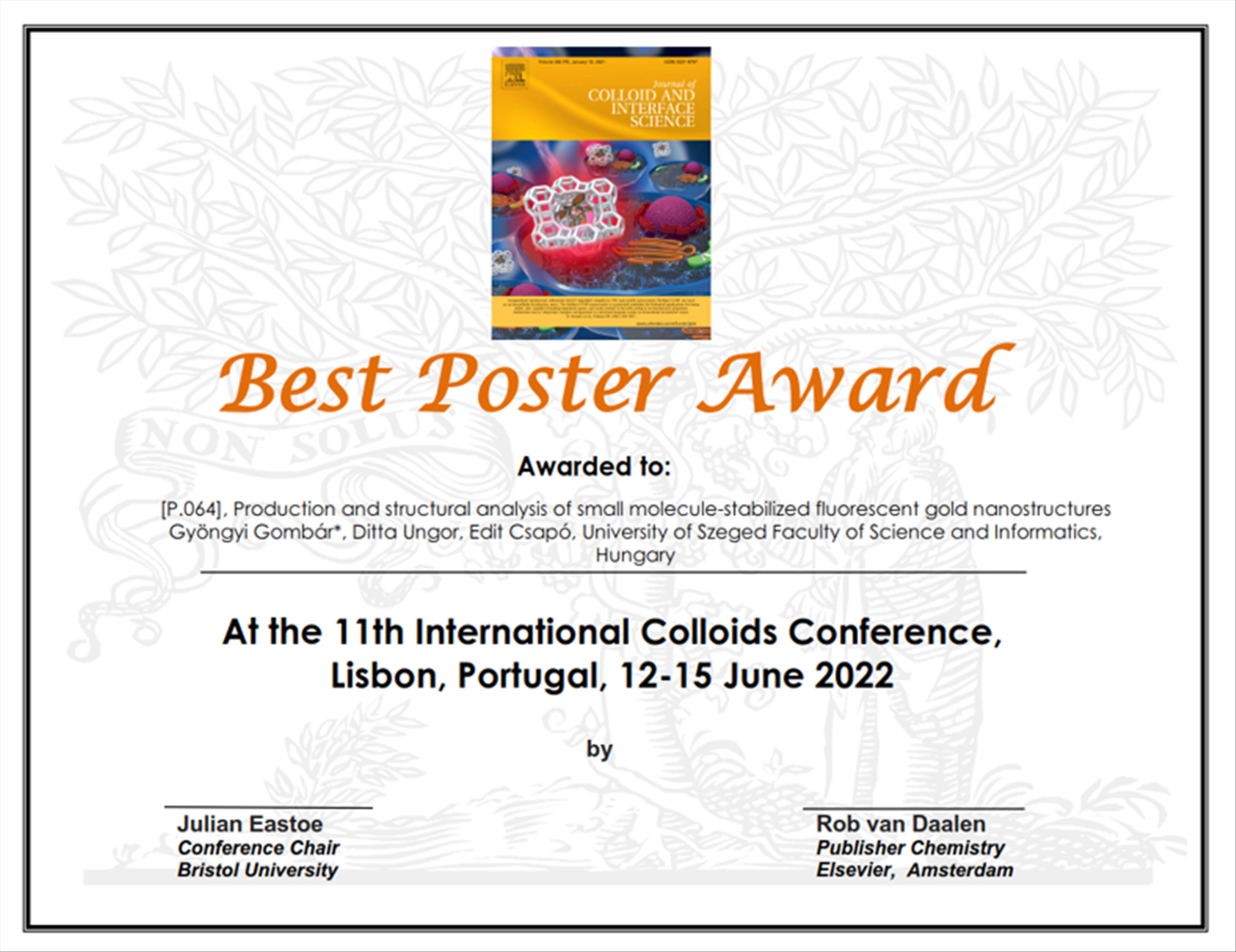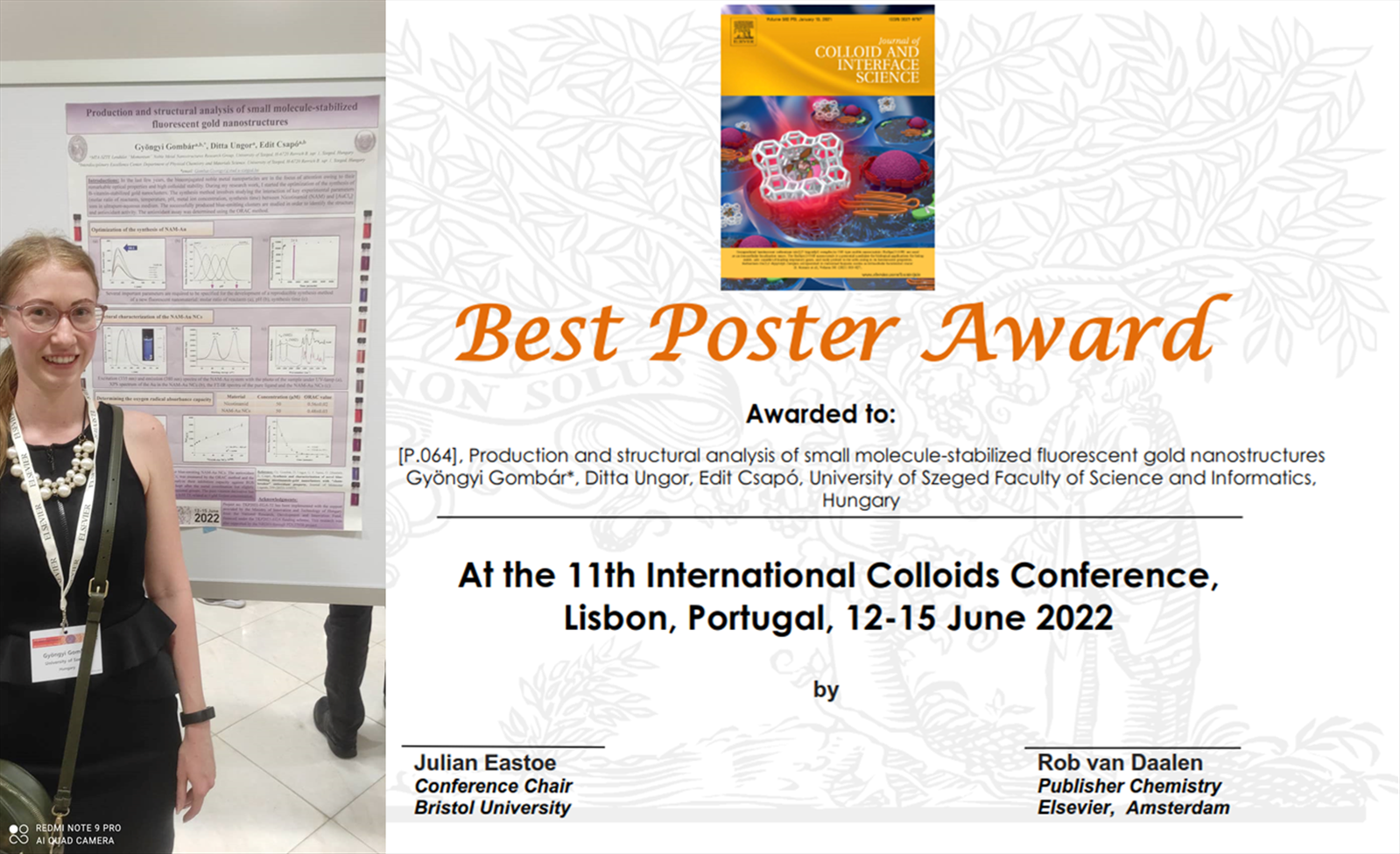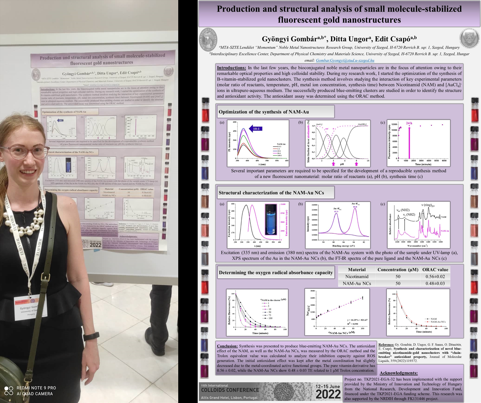 Gombár Gyöngyi doktori munkája során az elmúlt évben vitaminokkal stabilizált arany nanoklaszterek szintézisének optimalizálásával foglakozott. Ezen kutatás keretében a kulcsfontosságú kísérleti paraméterek (reagensek mólaránya, hőmérséklet, pH, fémion-koncentráció, szintézisidő) változtatása mellett vizsgálta a vitaminok és aurát ionok közötti reakcióban keletkező klaszterek optikai és kolloid sajátságait. Majd a sikeresen előállított, kék színben emittáló klaszterek szerkezetét és antioxidáns aktivitását vizsgálta. „Production and structural analysis of small molecule-stabilized fluorescent gold nanostructures” című poszterén ezen munka eredményeit mutatta be a 2022 június 12 és 15 között, Lisszabonban megendezett 11. Nemzetközi Kolloid Konferencián.