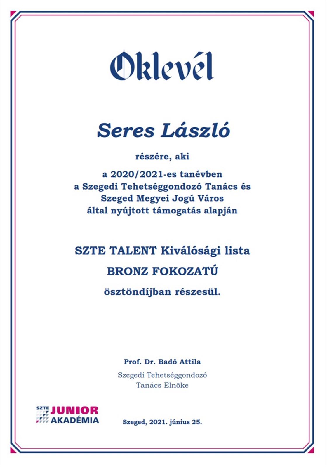 Seres László I. évf. vegyész MSc szakos hallgatónk a 2020/2021-es tanévben a Szegedi Tehetséggondozó Tanács és Szeged Megyei Jogú Város által nyújtott támogatás alapján SZTE TALENT Kiválósági lista BRONZ FOKOZATÚ ösztöndíjban részesül.A pályázatot tanévenként egyszer hirdeti meg a Szegedi Tehetséggondozó Tanács Szeged Megyei Jogú Város Önkormányzatával, és a Pro Talentis Universitatis Alapítvánnyal együttműködve a Szegedi Tudományegyetem hallgatói számára. A Kiválósági Listára három a graduális (Ba/BsC/Ma/MsC és osztatlan) képzésben résztvevők (ezen belül tudományterületenként alkategóriákban), sportolók és művészek jelentkezhetnek. A tudományos önéletrajza mellett Lászlót a korábban elnyert ösztöndíjai, TDK és OTDK helyezés, nemzetközi folyóiratban megjelent cikk [1] valamint szintén nemzetközi konferencia részvétele [2] végül de nem utolsó sorban demonstrátori tevékenysége alapján találták méltónak az elismerésre.