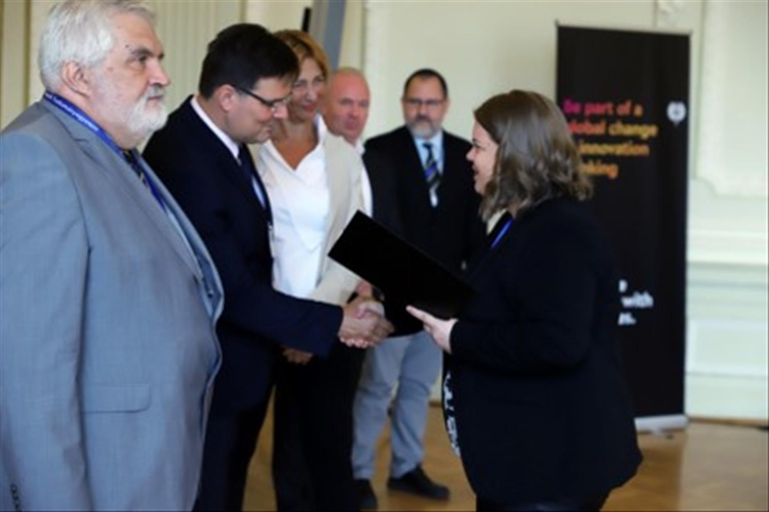 Ismét a Kutatócsoportunkba került a SZTE Innovációs Díja, amelyet a Szegedi Tudományegyetem 2016 óta oszt ki azzal a céllal, hogy az egyetem azon kutatóit és hallgatóit támogassa, akik az egyetemhez kötődő kutatómunkájuk során innovatív megoldást jelentő tudományos eredményt érnek el, amely szellemi alkotásnak minősül és üzleti szempontból hasznosítható lehet. Dr. Csapó Edit témavezetésével folytatott kutatómunkájának eredményeit a díjazott Janóné Dr. Ungor Ditta Anita „Arany nanorészecskék és nanoklaszterek szintézise, szerkezetvizsgálata és szenzorikai alkalmazásaik” című pályamunkájában foglalta össze, amelyért a 2019. május 30-án megrendezett Innovációs Napon a leginnovatívabb PhD munkáért járó elismerést vehette át.