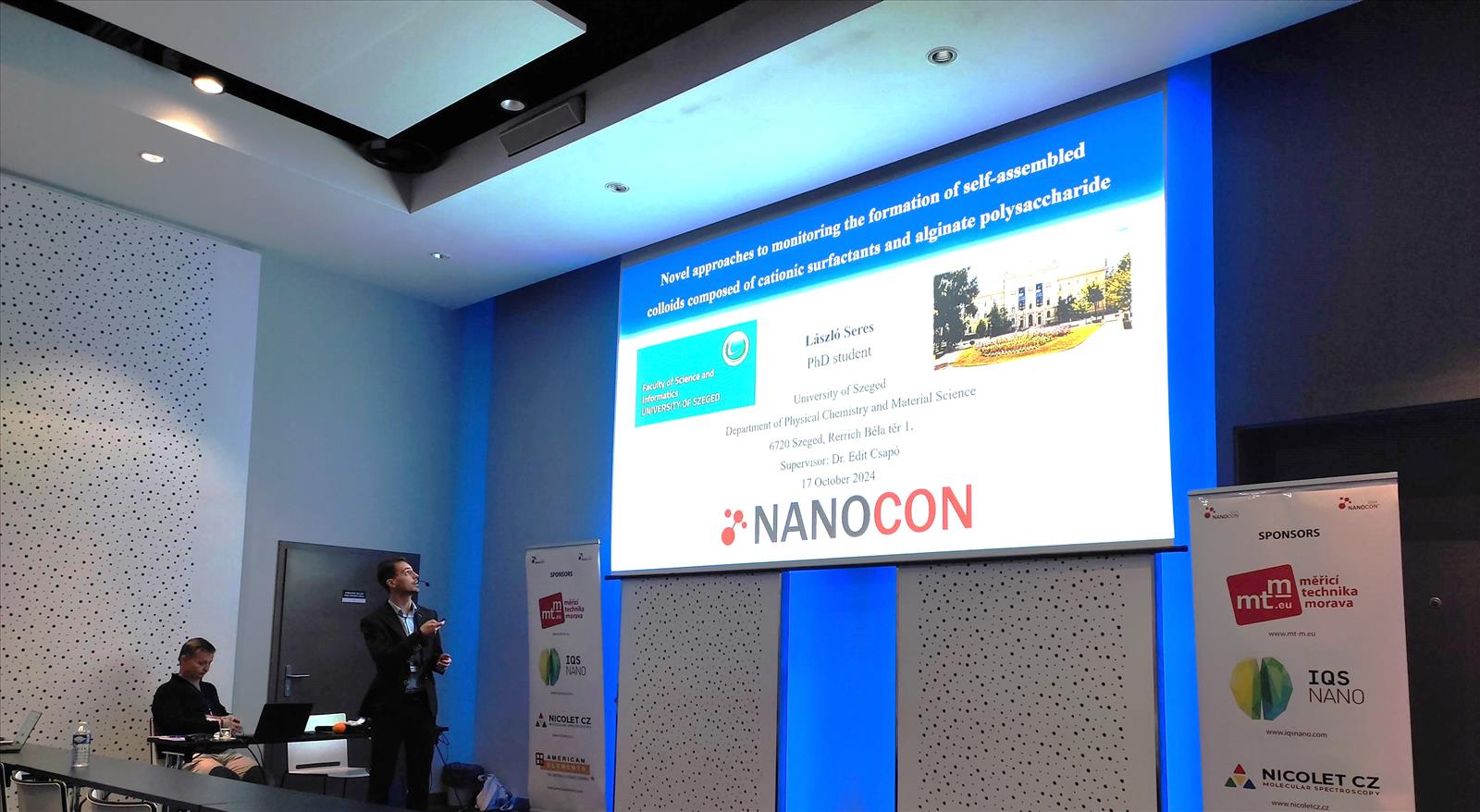 A 16th International Conference on Nanomaterials - Research & Application (NANOCON 2024.) elnevezésű konferencia tizenhat éve rendszeresen a Csehországi Brno városában kerül megrendezésre. A rendezvénynek 2024-ben is az Orea Congress Hotel nevű konferenciaközpont adott otthont. A 2024. október 16 és 18 között megrendezett konferencián, kutatócsoportunkból Seres László, Turcsányi Árpád és Juhász Ádám vett részt. Seres László október 17-én tartotta meg „Novel Approaches to Monitoring the Formation of Self-assembled Colloids Composed of Cationic Surfactants and Alginate Polysaccharide” című előadását, amelyet a konferencia zárónapján a „Dr. Tasilo Prnka Prize" for the authors under age of 33” díj különdíjával jutalmaztak a szervezők. Kutatócsoportunk minden tagja nevében szívből gratulálunk Lacinak a díj elnyeréséhez.