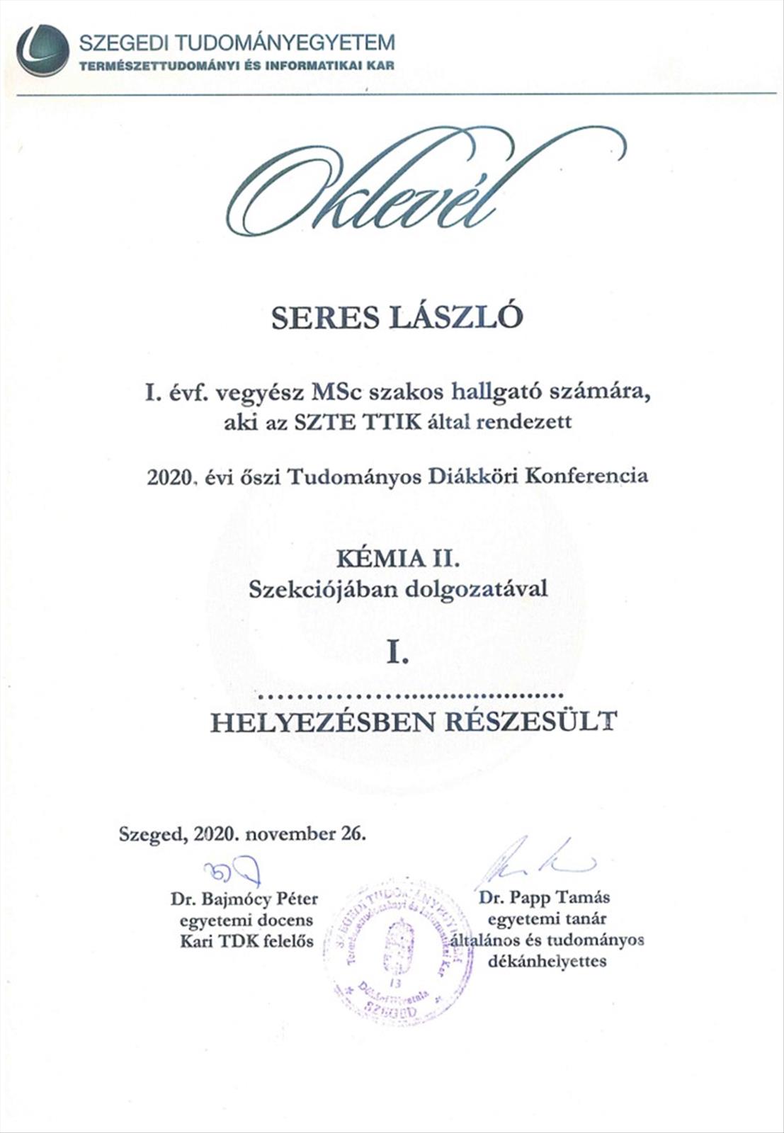 Korábbi szakdolgozónk és jelenlegi Tudományos Diákköri munkában résztvevő hallgatónk, Seres László a 2020. évi őszi Tudományos Diákköri Konferencia Kémia II. szekciójában I. helyezésben részesült.