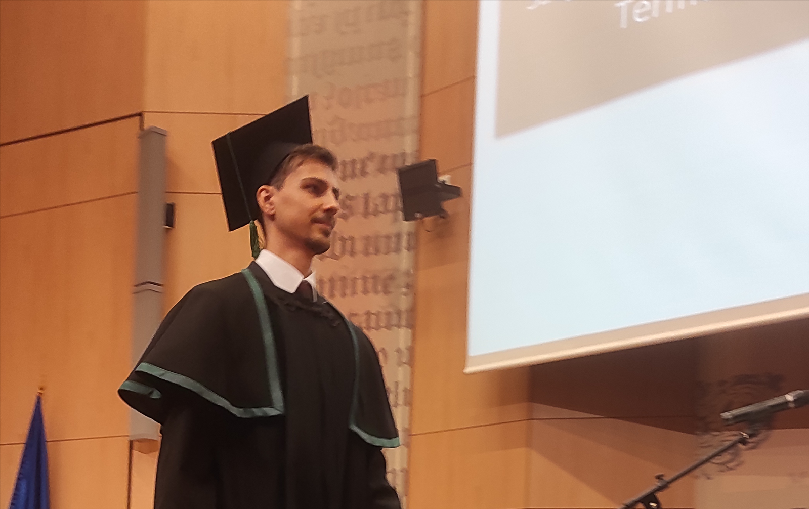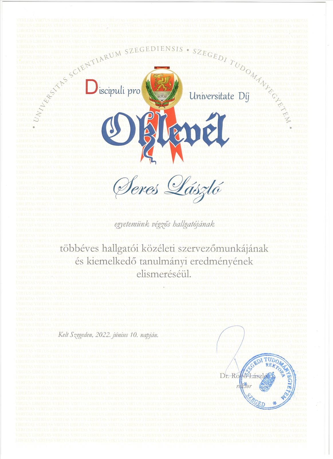 Frissen diplomázott Seres László vegyész MSc kollégánk a hallgatók részére adható legmagasabb szintű egyetemi kitüntetést (Discipuli Pro Universitate Díj) vett át Prof. Dr. Kónya Zoltán rektorhelyettestől. A díjat a József Attila Tanulmányi és Információs Központban, a Szegedi Tudományegyetem Természettudományi és Informatikai Karának 2022. július 3-án megrendezett diplomaosztó ünnepségén adták át.