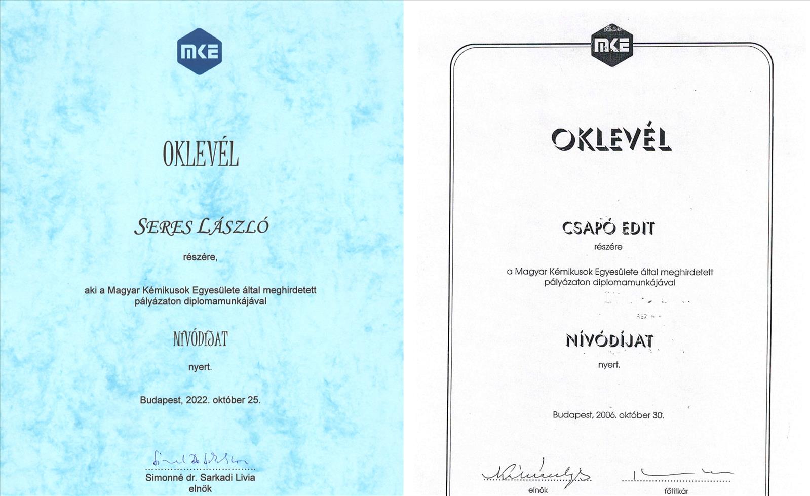 Különös és örömteli párhuzam, hogy 16 évvel ezelőtt, 2006 októberében László témavezetője Dr. Csapó Edit vehette át a nívódíjat a Szegedi Akadémiai Bizottság Székházában Prof. Dr. Fülöp Ferenc akadémikustól. Kutatócsoportunk vezetője a Debreceni Egyetem Szervetlen és Analitikai Kémiai Tanszékén, Prof. Dr. Farkas Etelka egyetemi tanár témavezetésével készítette el „Új sziderofór modellek Cu(II), Ni(II) és ZN(II) komplexeinek oldategyensúlyi vizsgálata” című nívódíjas diplomamunkáját.